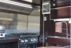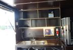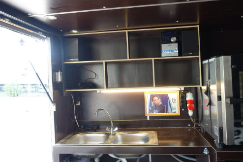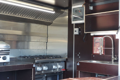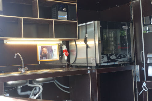 Die Einrichtung beinhaltet drei Waschbecken, eine starke Absaugung ( 4000 qm / h ), eine Kraftstromverteilung ( bis zu 40 kw ), eine großzügige und beleuchtete Verkaufsklappe, einen Kombidämpfer ( 4 x 1/1 gn ) und natürlich die obligatorische Stereo-Anlage. Sämtliche Einrichtungen sind modular aufgebaut und lassen sich bei Bedarf rasch entfernen bzw. umarrangieren.